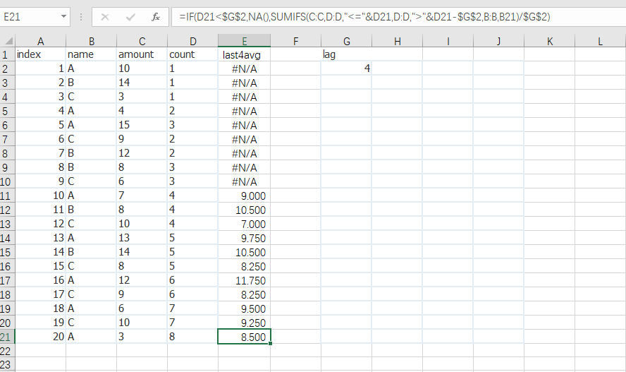 如何計出, A,B,C "近三次"平均amount, 不足3次出na值