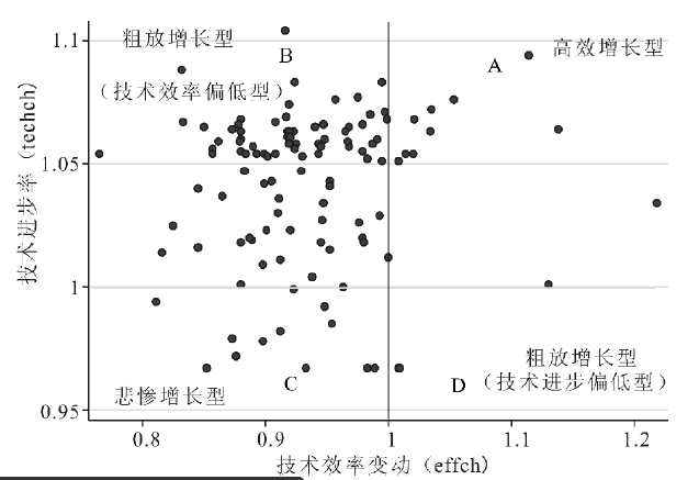 这个图就是技术效率变动做X,技术进步率做Y画出来的散点图。只要你有这两者的数据就可以画出来。其它的文字自己加。