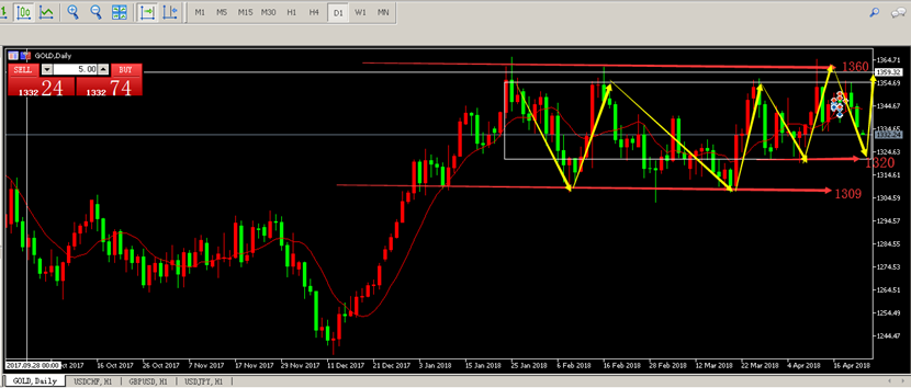 上一周黄金走势可谓“一朝回到解放前”,录得本月以来首周下跌,重返1340美元/盎司的关口下方,主要因叙利亚危机缓和、朝鲜半岛局势出现大反转以及美元尾盘强势反攻,黄金遭受获利了结,最终收于1335.30美元/盎司,本周测试1320强支撑点位。今日观点--逢高做空,高空为主:在1336附近做空,目标1325-1327,损1340。