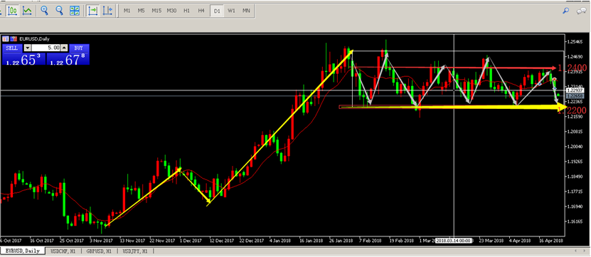 上周欧美日线图来看,技术指标指向下行延伸,欧美跌破20日均线,目前试图挑战100日均线,而技术指标已经跌破中线至看空区域,存在强劲的下倾偏向欧美日线级别在高位继续盘整,整体趋势依旧以大区间(1.22000--1.24500)来回高位震荡, 从形态上来分析欧美突破无效,转空迹象明显,维持箱体上下轨压承走势,今日观点:高空为主,(1.22000---1.23000)。今日布局1.22800—1.22900之间做空欧美,目标1.22200---1.22000,损1.23100;