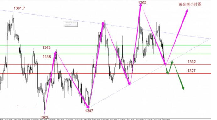 总体上黄金当下存在下跌的可能,但是重要节点附近仍然会出现反弹,虽然MACD下行趋势可能出现超卖,但是KDJ与K线均线本身显示可能出现极端快速下行,所以日内交易只在节点1332附近考虑一次反弹,反弹后再继续沿着均线下行,日内不破4小时周期10MA不看涨只看反弹。黄金上周五展开深度回调,但目前运行于上行趋势线附近,金价存在反弹可能性,关注该位企稳状况。