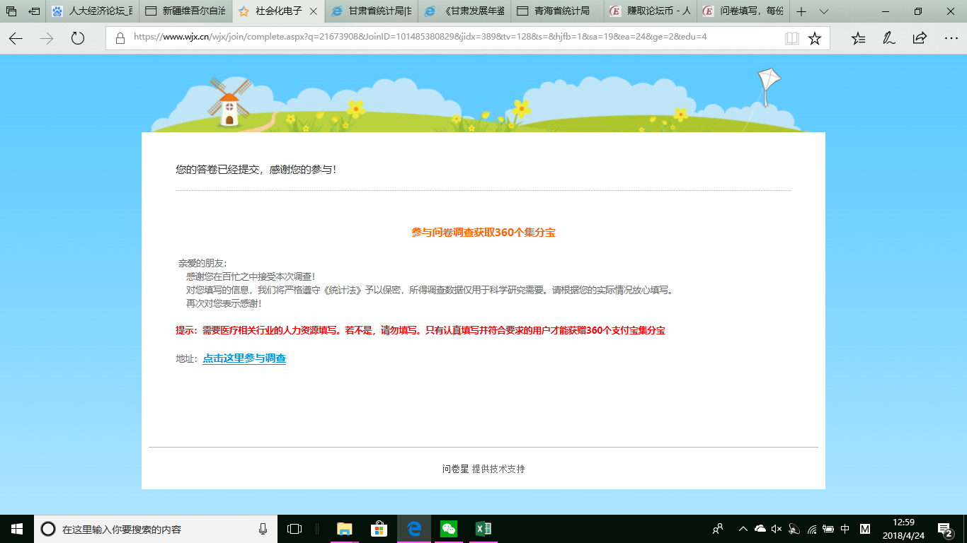 大家好,这是一份关于电子商务的调查问卷,主要是研究社会化电子商务,即电子商务与社交媒体整合的一份问卷。填写时间大概需要三四分钟,问卷填写完可以领取20个论坛币,希望愿意填写的各位朋友认真填写,不胜感激,一共需要200份,该帐号共有论坛币3000个,不足的到时候我会用我同学的帐号购买。
