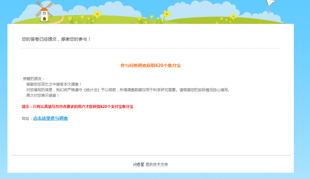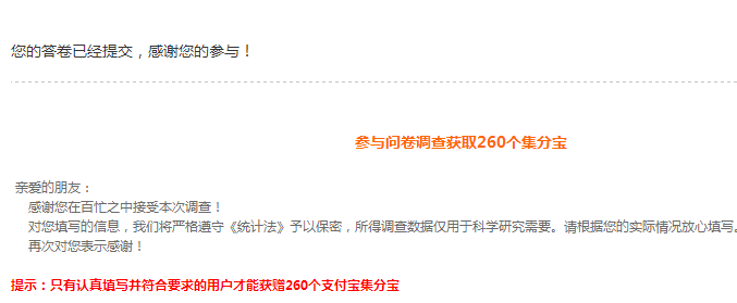 (本号已经没有论坛币,此帖勿回。另用我舍友的帐号另开一个帖子,还缺50份问卷,关于已经回复此帖,但是由于金额设置错误或者没有设置金额等原因,没有到帐的,在该帖留言即可,会有处理)如果不想做,真的请您不要勉强做,谢谢合作。大部分同学还是认真填写的,但是还有很多人乱填,几十秒解决战斗,麻烦您不想做,真的不要做,谢谢。