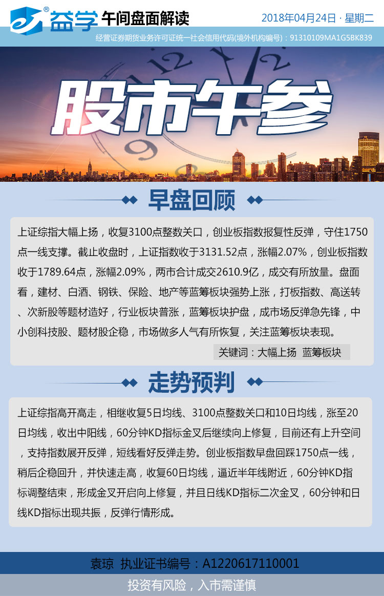 上证综指大幅上扬,收复3100点整数关口,创业板指数报复性反弹,守住1750点一线支撑。截止收盘时,上证指数收于3131.52点,涨幅2.07%,创业板指数收于1789.64点,涨幅2.09%,两市合计成交2610.9亿,成交有所放量。盘面看,建材、白酒、钢铁、保险、地产等蓝筹板块强势上涨,打板指数、高送转、次新股等题材造好,行业板块普涨,蓝筹板块护盘,成市场反弹急先锋,中小创科技股、题材股企稳,市场做多人气有所恢复,关注蓝筹板块表现。