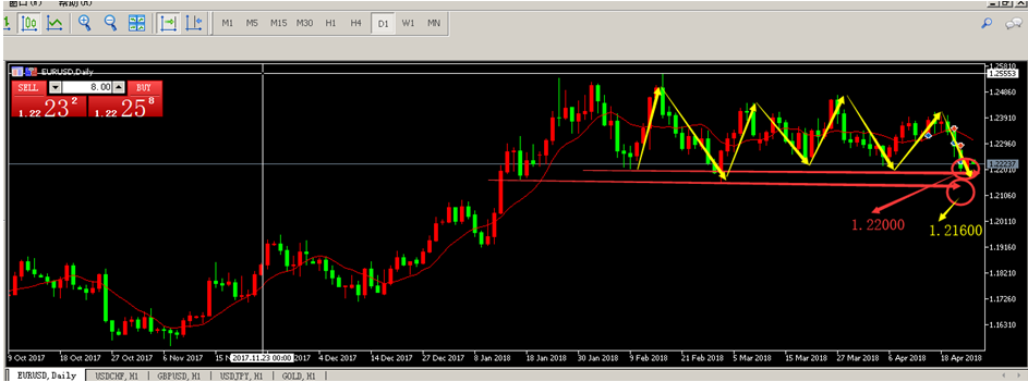 昨日欧美低位震荡回调,从日线图来看,技术指标指向下行延伸,欧美跌破20日均线,目前试图挑战100日均线,而技术指标已经跌破中线至看空区域,存在强劲的下倾偏向, 从形态上来分析欧美突破无效,转空迹象明显,维持箱体上下轨压承走势,今日观点:继续测试下轨,高空为主,(1.21800---1.2200)。今日布局1.22300—1.22400之间做空欧美,目标1.21800---1.22000,损1.22700。