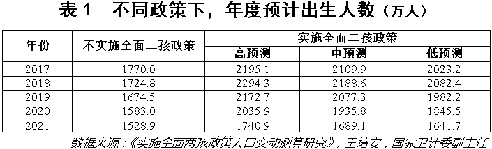 可是,适龄劳动力的补充却不容易。2018年年初,国家统计局公布的一份生育数据显示,2017年我国出生人口为1723万人,比上年的1786万人下降了63万人,且远低于国家卫计委的预测数值(详见表1)。这预示着,即便国家二胎政策已经全面放开,但老百姓生育的意愿仍在不可避免地走低。