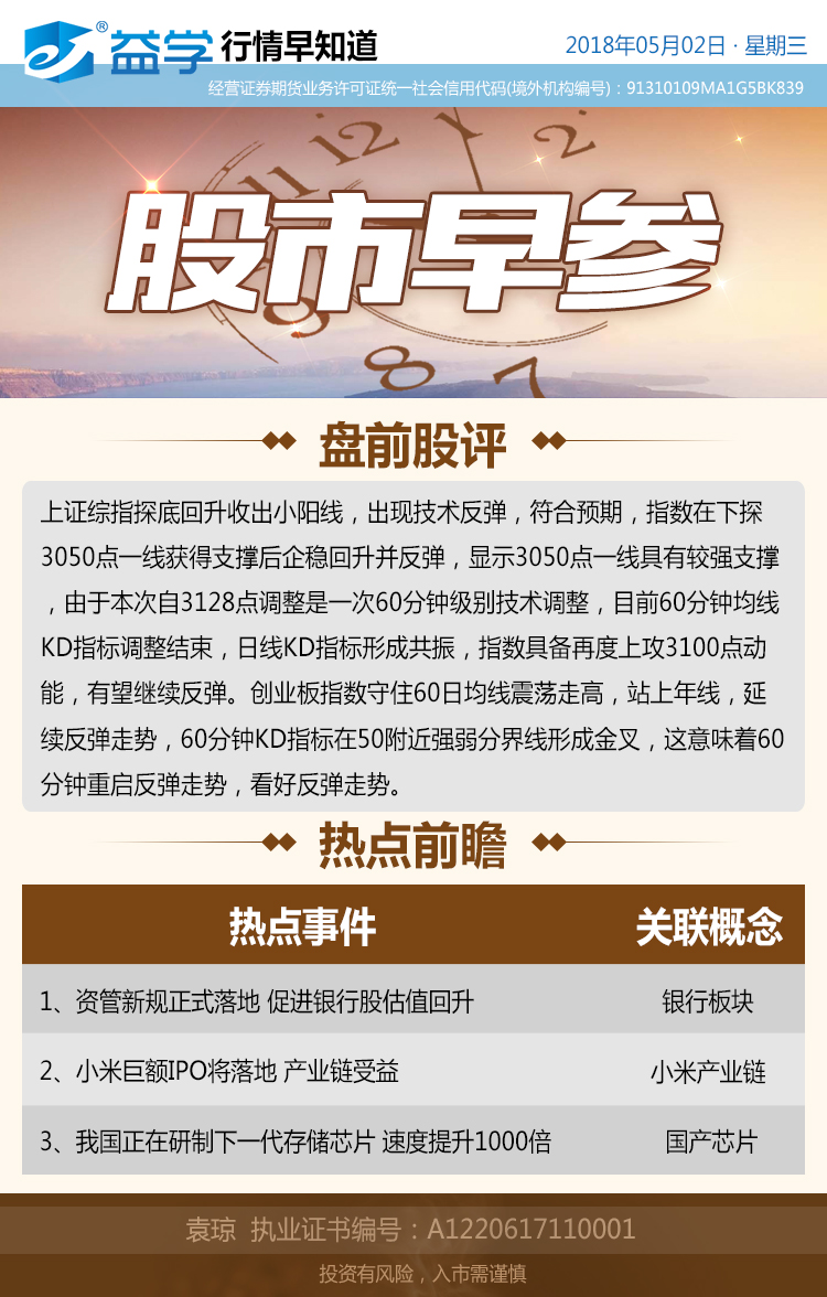 上证综指探底回升收出小阳线,出现技术反弹,符合预期,指数在下探3050点一线获得支撑后企稳回升并反弹,显示3050点一线具有较强支撑,由于本次自3128点调整是一次60分钟级别技术调整,目前60分钟均线KD指标调整结束,日线KD指标形成共振,指数具备再度上攻3100点动能,有望继续反弹。创业板指数守住60日均线震荡走高,站上年线,延续反弹走势,60分钟KD指标在50附近强弱分界线形成金叉,这意味着60分钟重启反弹走势,看好反弹走势。