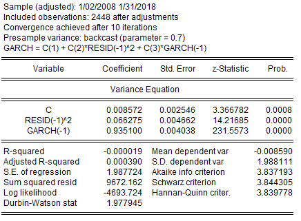 “但是α+β大于1,没有满足参数的约束条件,表明在过去的波动和外界的冲击下,汇率会出现一定大幅度波动,需要有较长时间的调整。”——翟爱梅在《基于GARCH模型对人民币汇率波动的实证研究》给出的解释