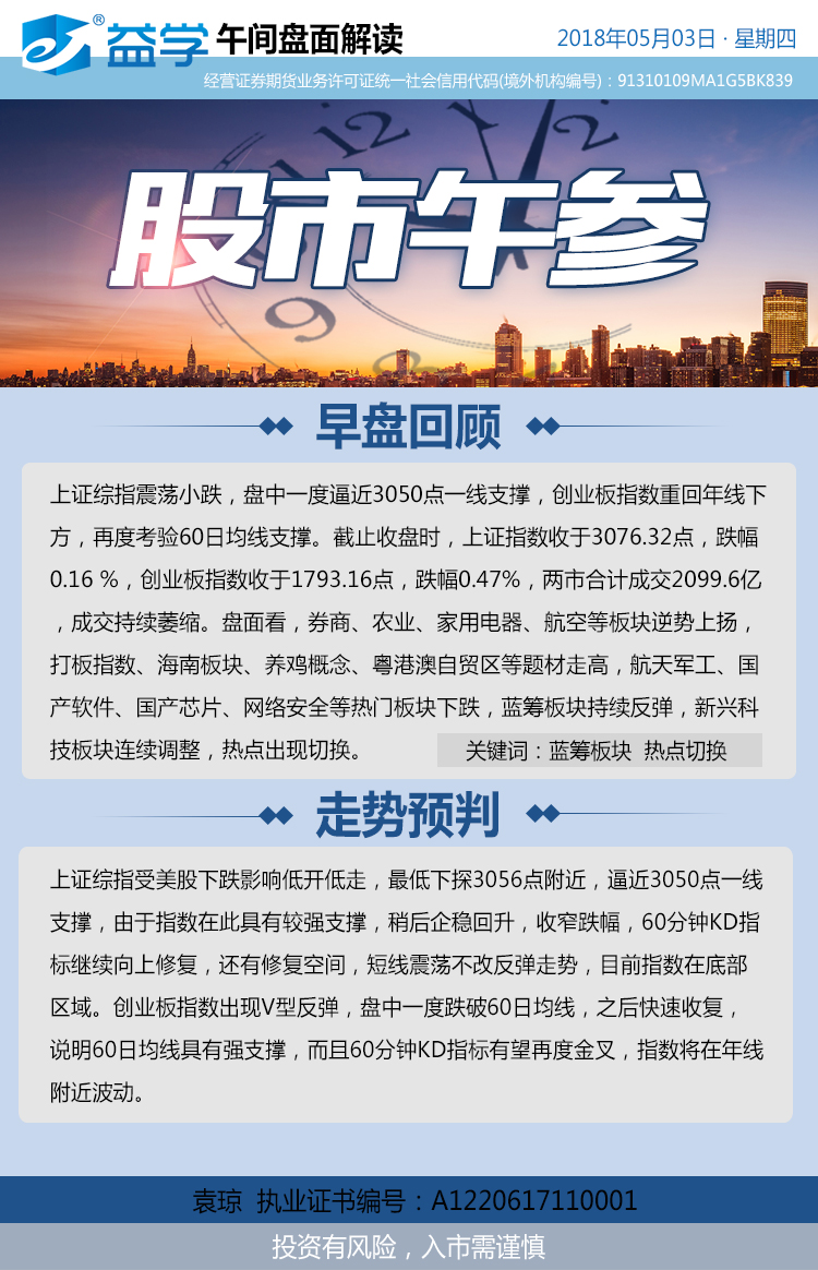 上证综指震荡小跌,盘中一度逼近3050点一线支撑,创业板指数重回年线下方,再度考验60日均线支撑。截止收盘时,上证指数收于3076.32点,跌幅0.16 %,创业板指数收于1793.16点,跌幅0.47%,两市合计成交2099.6亿,成交持续萎缩。盘面看,券商、农业、家用电器、航空等板块逆势上扬,打板指数、海南板块、养鸡概念、粤港澳自贸区等题材走高,航天军工、国产软件、国产芯片、网络安全等热门板块下跌,蓝筹板块持续反弹,新兴科技板块连续调整,热点出现切换。