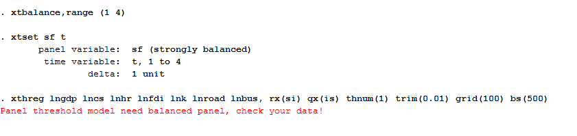 wtt2016 发表于 2019-1-4 15:45 您好黄老师,我尝试了xthreg,并用了xtbalance平衡数据,但是还是提示非平衡,请问是怎么回事呢?