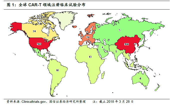 CAR-T 治疗目前主打血液瘤市场,实体瘤治疗待研究突破。目前CAR-T 研究的适应症主要针对血液瘤和实体瘤,现阶段血液肿瘤一线化疗、干细胞移植等治疗方法下患者生存质量较差且复发率高,CAR-T 疗法随着技术不断成熟,有望逐步走向血液肿瘤的一线治疗。近年来针对实体瘤的CAR-T 基础研究进展迅速,虽目前在临床转化方面相对滞后,随着实体瘤技术的不断突破,未来CAR-T市场空间更是有较大空间。据Markets and Markets 预测,全球肿瘤免疫治疗市场规模将从2016 年的619 亿美元增长到2021 年的1194 亿美元,年复合增长率达14%。