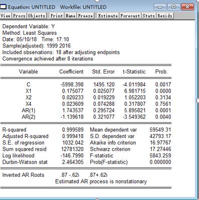 用拉格朗日发现存在二阶自相关,用迭代法后DW值>4-du=2.46,无法消除自相关,而且t值不通过(什么原因),所以应该怎样消除自相关?用Eviews做