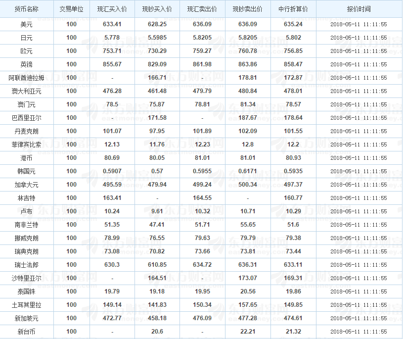 中国银行外汇牌价 2018-05-11(图片来源:东方财富网)