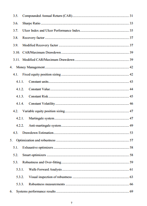 Theoretical part of this thesis is covered in Chapters 1 and 2 with the analytical part and solutions presented for every major goal in Chapters 3, 4 and 5. The contribution of this thesis is in the refinement of existing performance metrics to make them more dependable for development and comparison of systems, the introduction of robustness measurements and a different take on money management - focusing on drawdown estimation. I would like to express my gratitude towards my supervisor Dr. Juraj Pancik for his guidance. I would also like to state that I wrote this thesis independently, with guidance from diploma thesis supervisor and I used literature referenced at the end.