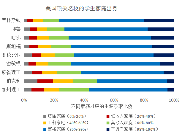 图1给出了美国9所顶尖名校的大学生,家庭出身的大致分布。家庭收入分成按照人口分成五等分(quintile),最后顶尖的五分之一又细分出来。0-20%指家庭收入在美国底层1/5的人口,暂时称之为贫困家庭;20-40%则是家庭收入在美国底部排名1/5-2/5的低收入家庭;40%-60%也是占了美国1/5的人口,称之为工薪家庭;60%-80%的收入较高,高收入家庭;80%-100%占了美国人口收入顶尖的1/5。这最后的五等分的顶尖的一组分成80%-99%的,称之为富裕家庭和,以及99%-100%是最高1%的人口,这里称为有资产的家庭。具体的不同组别的称法并不重要,重要的是这些人在收入群体的相对位置。数据是从拉杰·切提(Raj Chetty)[1]的发表的科研论文中抽取,主要选取了中国人比较耳熟能详的八所大学,数据是切提与合作者根据公开数据经过统计和经济学模型处理后的估计值(estimate)。 拉杰·切提是美国斯坦福大学经济学教授,2018年38岁便评上了美国科学院院士(Member of National Academy of Science),他的研究主要着重于机会平等,教育流动性以及一些不平等的研究。有兴趣的读者可以去看看其他大学的数据以及这篇论文的整体思想。