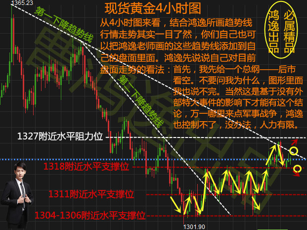 上周没有跟上的朋友们也不要气馁,本周只要你跟紧鸿逸的步伐,定会有所收获。昨日如果你有看到鸿逸的策略,但没有跟上的话那就是你的损失了,机不可失,失不再来。鸿逸也提倡大家做自己能看懂的行情,不懂时宁愿观望也不要随意入场以免造成亏损。从日图来看,MACD、KD及均线等指标目前已无法准确给出操作方向,日图从技术面来看此时已进入偏震荡行情。4小时图来看,MACD、KD等指标均呈死叉,均线空头排列,行情已成功下破1318一线,但下方受到1312附近强力支撑,短期内将会是区间盘整行情,盘整区间为1311-1318。结合下方图形,大家就能有直观的了解,我们静待行情再次选择方向,或待行情回调至1317附近再入场做空。而鸿逸周一所画图中所说中期金价看空,只是结合现在盘面给出的,行情具体走势以实盘为准。下方趋势图及文字是鸿逸昨日(5月14日所撰),大家可以把鸿逸所画的线添加到自己的盘面中,本周都适用。