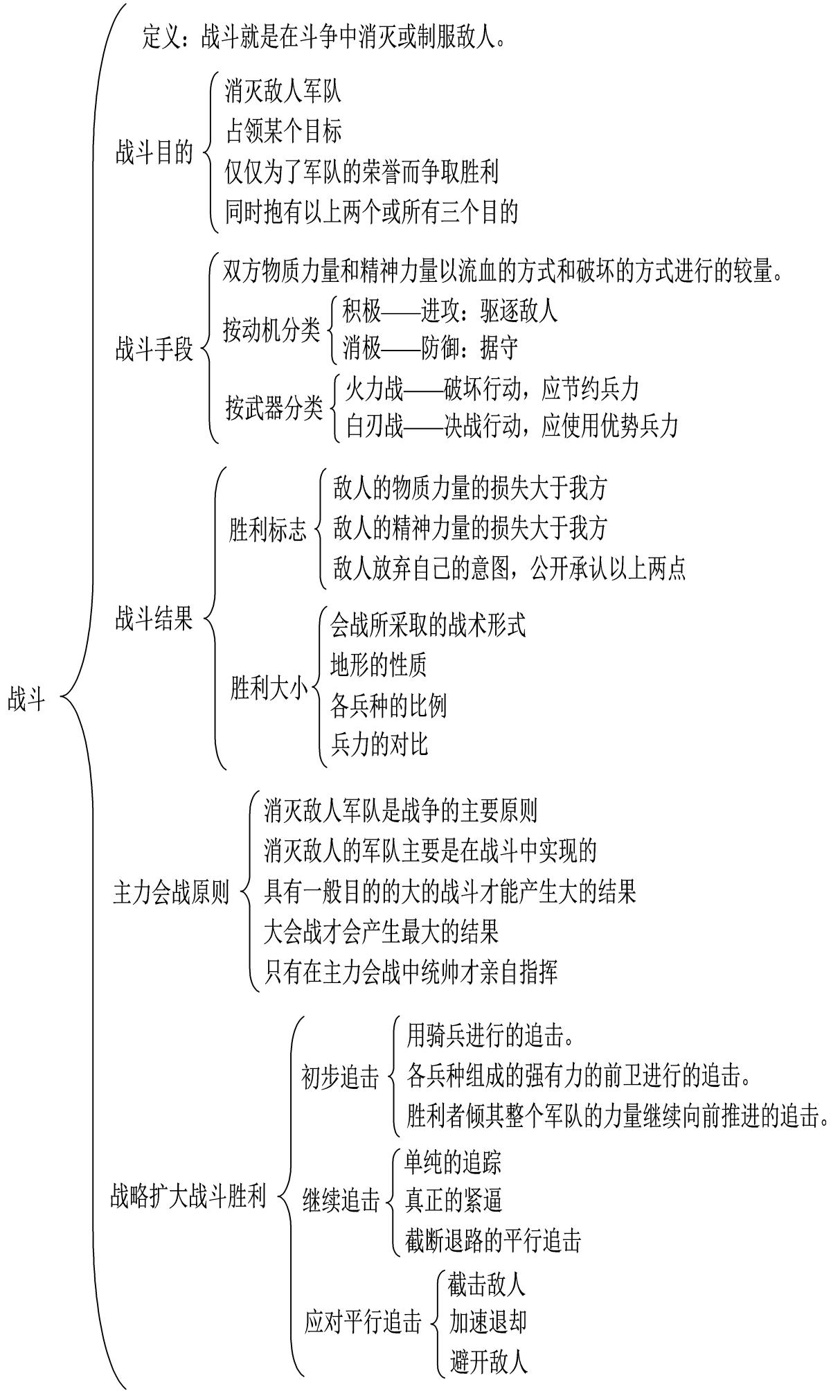战斗的定义是:战斗就是在斗争中消灭或制服敌人。《战争论》写道:“战斗就是斗争,在斗争中目的是消灭或制服敌人,而敌人就是在具体战斗中和我们对峙的军队。”