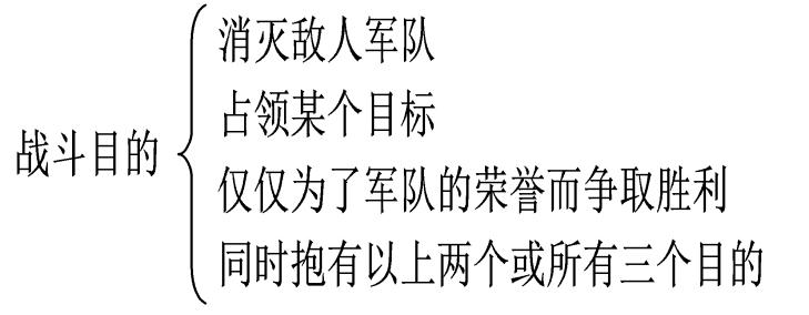 战斗的目的有4个,包括消灭敌人的军队,占领某个目标,仅仅为了军队的荣誉而争取胜利,同时抱有以上两个或所有三个目的。其中消灭敌人军队是战斗的主要目标(如图2所示)。