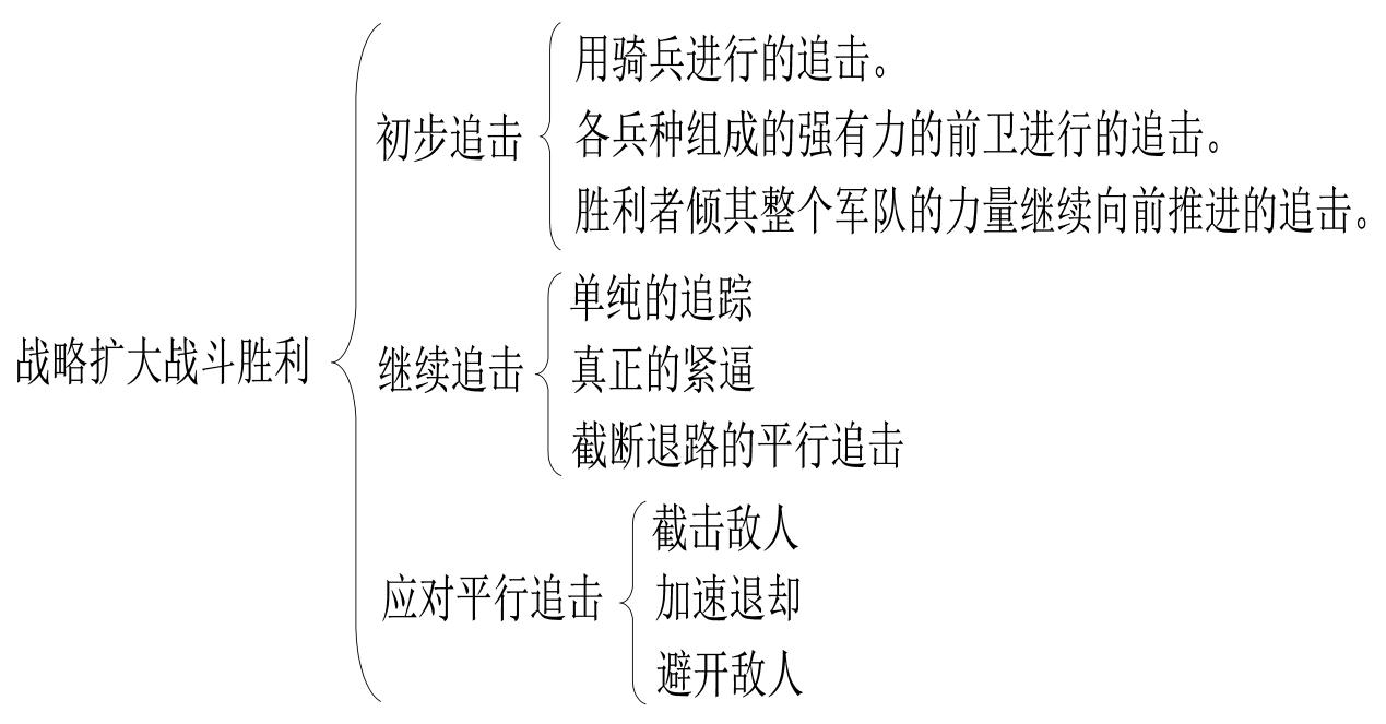 战斗胜利之后,如果不对敌人进行追击,那么就不能获得大的胜利,所以需要在战略上利用战术上的胜利,通过追击来获得更大的成果。《战争论》写道:“不进行追击,任何胜利都不能取得巨大的效果。胜利的大小主要取决于追击时的猛烈程度;追击是取得胜利的第二个步骤,在许多情况下甚至比第一个步骤更为重要;战略为了同战术接近,以便利用战术上取得的完整的成果,就要求战术获得全胜(如图6所示)。”