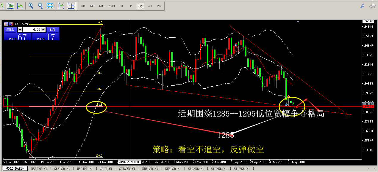 昨日黄金小创新低,日线以温水煮青蛙小幅下跌,短期不宜过于看空,视为低位宽震格局,策略上反弹高空,关注小区间1285-1295。行情空头控盘,又加息的来临,空头通道进一步得到市场认可,但密切关注白银走势是否加长黄金破位新低的空间。今日上方重点关注1295阻力,下方关注1285支撑。今日观点:顺势而为,高空为主。1.建议在1294附近直接做空,损1298,目标1286—1282.2.激进者可在1285附近轻仓做多,损1280,目标上方1290.
