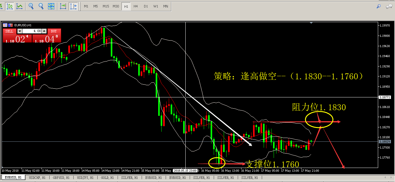 昨日欧美延续弱势下跌,多头继续挣扎,实则为空头获得更大的时间和空间上的布局,录得日线一根加速下跌的新通道产生。外围意大利政局突变,更加让市场对欧美倾向偏空。总之,顺势而为,逢高做空。今日观点:高空为主,顺势而为。1.欧美在1.1830附近做空,损1.1870,目标暂看1.1760-1.1740;