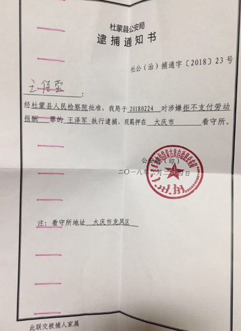 2月12日晚七点,杜蒙公安局以对账为由将工程五项的包工头王泽军带走,次日通知王泽军家属王泽军已经被拘留。5月12日,架子工头沈凤双在躲了三个多月以后,也被杜尔伯特警方抓住,力瓦工头孙宇、钢筋工头张毕辉都遭到网上通缉,罪名皆为拒不支付劳动报酬罪,公安局至今不让几人与家属见面。