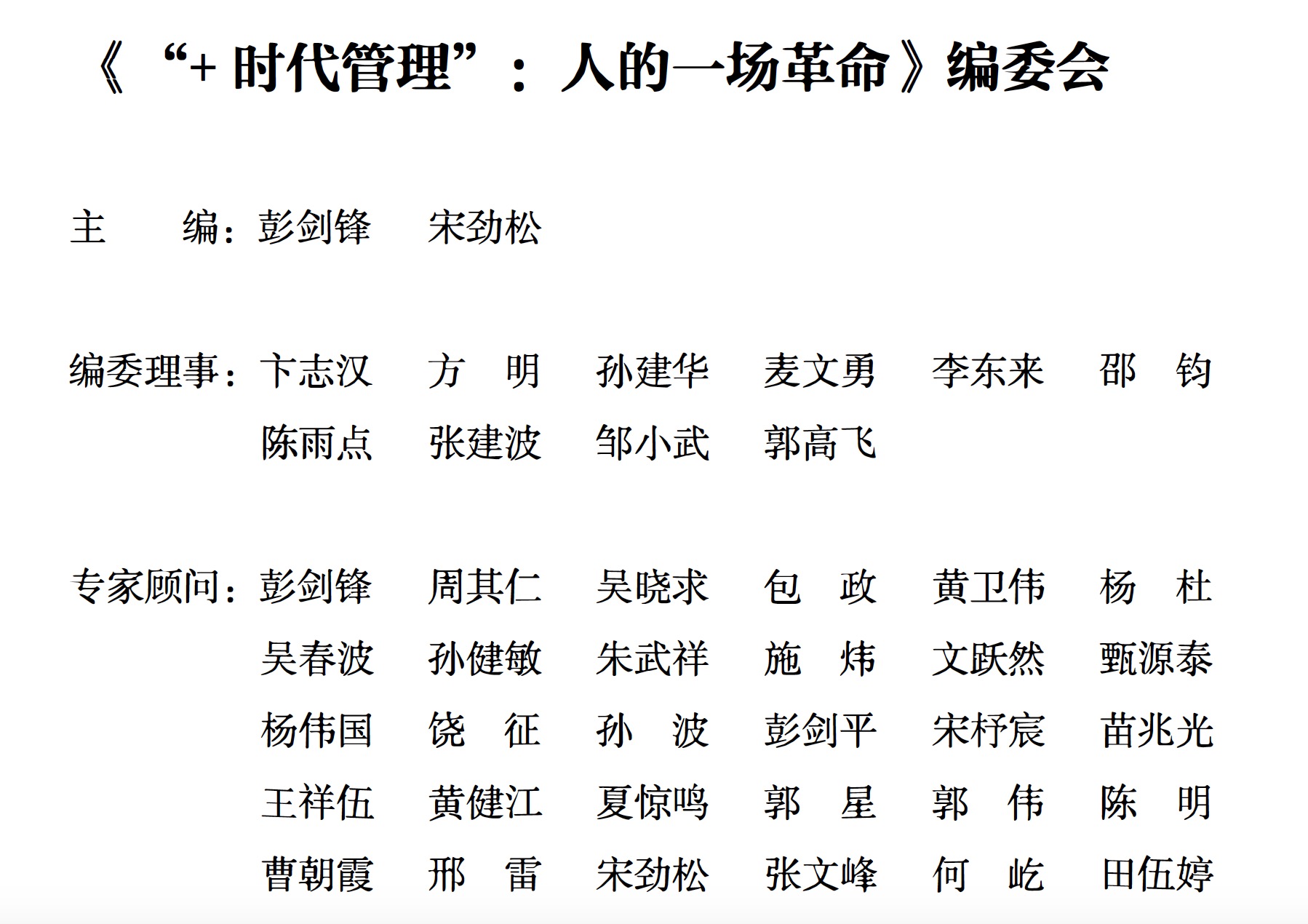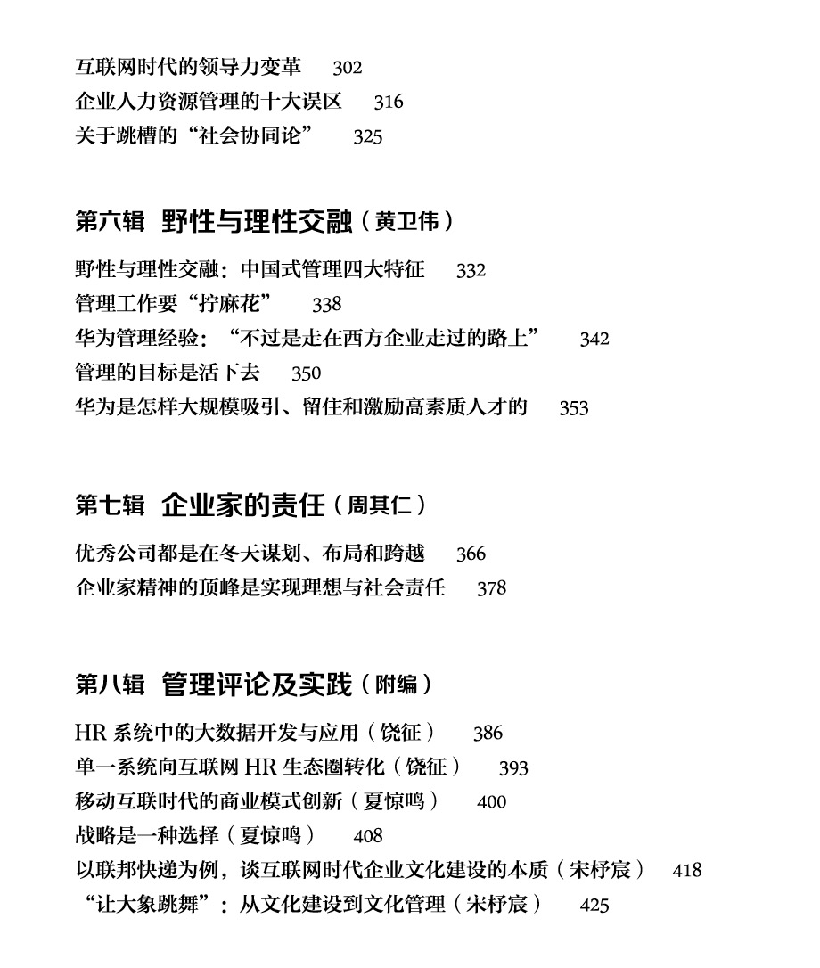 最后我们要表达我们的最真挚的谢意, 一本书的完成都是基于通力合作方可能实现。 感谢本书作者彭剑锋、吴春波、施炸、杨杜、孙健敏、黄卫伟等老师的思想智慧贡献, 我们相信这些思想是这个时代最宝贵的财富。 同时感谢所有的赞赏者, 为本书的顺利出版提供了资金保障,特别是我们的编委理事们,给予了不少珍贵建议以及亲自参与到书的出版全过程,这恰恰呼应了互联网时代新的价值表达方式。 也感谢中国计划出版社编辑的专业精神和高效率运作,使得书能在最短的时间里高品质、高规格地出版。