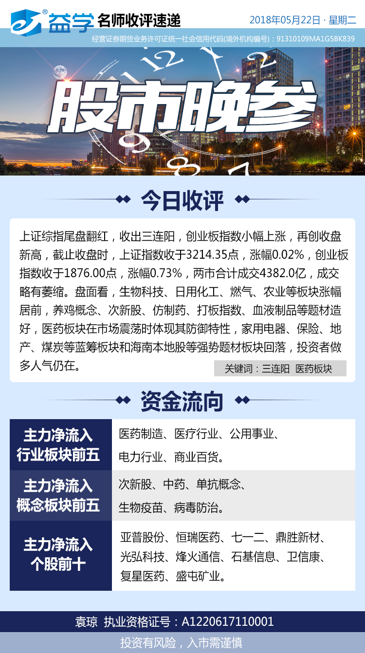 上证综指尾盘翻红,收出三连阳,创业板指数小幅上涨,再创收盘新高,截止收盘时,上证指数收于3214.35点,涨幅0.02%,创业板指数收于1876.00点,涨幅0.73%,两市合计成交4382.0亿,成交略有萎缩。盘面看,生物科技、日用化工、燃气、农业等板块涨幅居前,养鸡概念、次新股、仿制药、打板指数、血液制品等题材造好,医药板块在市场震荡时体现其防御特性,家用电器、保险、地产、煤炭等蓝筹板块和海南本地股等强势题材板块回落,投资者做多人气仍在。