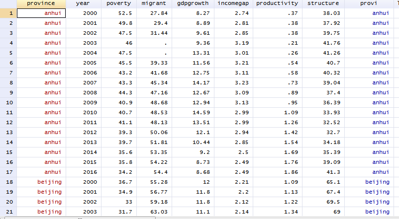 大壹子 发表于 2018-5-23 16:04 gen area=. replace area=1 if province=="11" | province=="12" | province=="13"