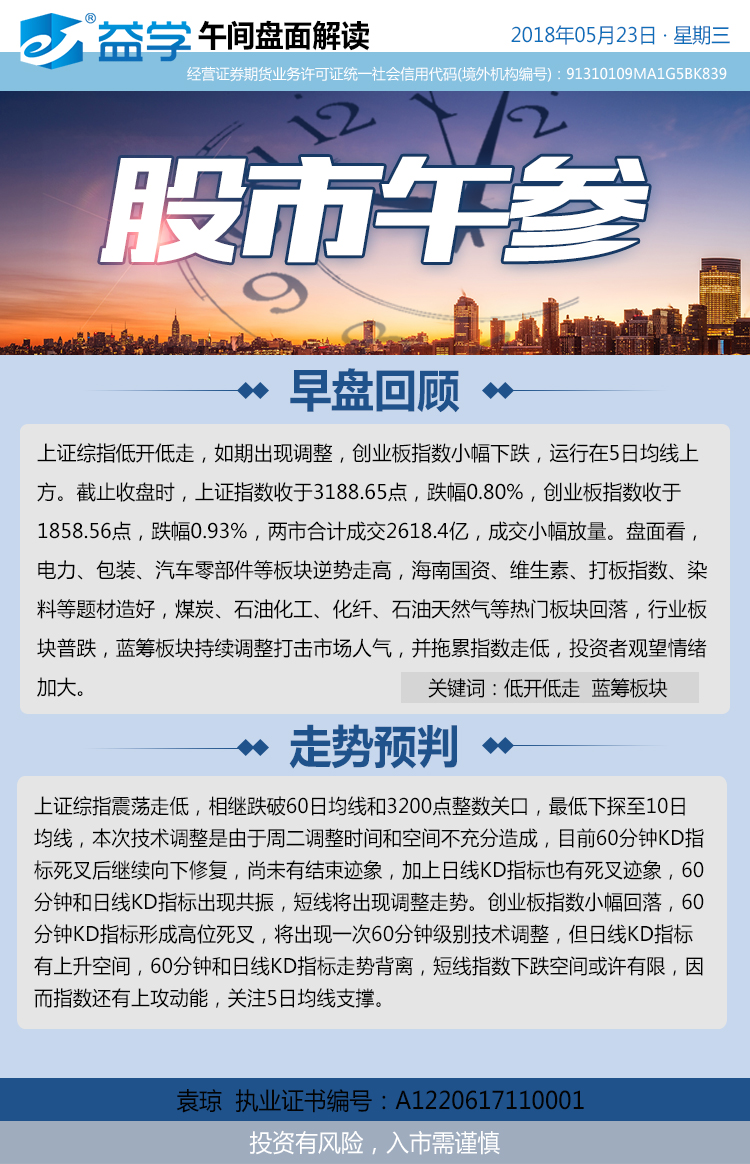 上证综指低开低走,如期出现调整,创业板指数小幅下跌,运行在5日均线上方。截止收盘时,上证指数收于3188.65点,跌幅0.80%,创业板指数收于1858.56点,跌幅0.93%,两市合计成交2618.4亿,成交小幅放量。盘面看,电力、包装、汽车零部件等板块逆势走高,海南国资、维生素、打板指数、染料等题材造好,煤炭、石油化工、化纤、石油天然气等热门板块回落,行业板块普跌,蓝筹板块持续调整打击市场人气,并拖累指数走低,投资者观望情绪加大。