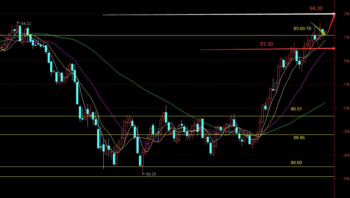 美元指数:94.00—93.55的区间下买入,有效破位20个点。