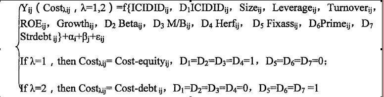 例如:研究某某因素对权益和债务资本成本的哪个影响程度更大,由于影响债务成本和权益成本的因素不同,所以将被解释变量分成权益和债务两部分,然后根据被解释变量(如上图:ICIDID)的交互项D1的正负确定影响程度大小。求如何实现?