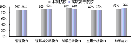 四川省2008届大学毕业生五大类基本工作能力的能力满足度较高的依次为科学思维能力、动手能力、理解与交流能力,较低的为应用分析能力、管理能力。