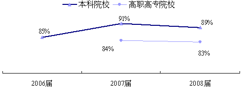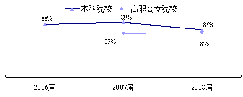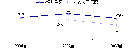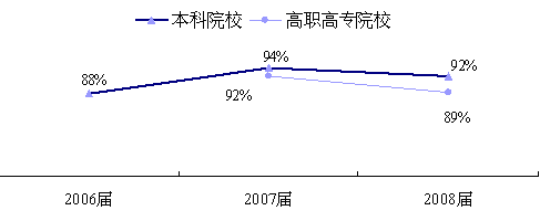| 006、2007和2008届大学毕业生就业率的三年趋势图 |