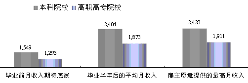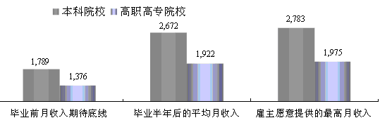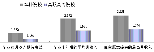 四川省2008届本科毕业生的期待月收入、实际月收入与雇主愿意提供的最高月收入分别为1532元、2392元和2551元;高职高专毕业生的期待月收入、实际月收入和雇主愿意提供的最高月收入则分别为1162元、1681元和1744元。当前大学毕业生对薪资的期待较为理性,本科和高职高专毕业生的期待月收入分别低于实际月收入860元、519元;实际月收入低于雇主愿意提供的最高月收入说明大学生择业时并不以薪资为第一考量,还综合考虑了个人发展空间、企业前景等因素。