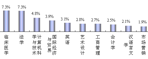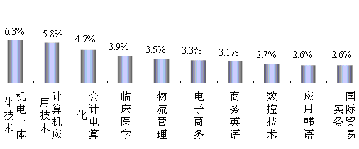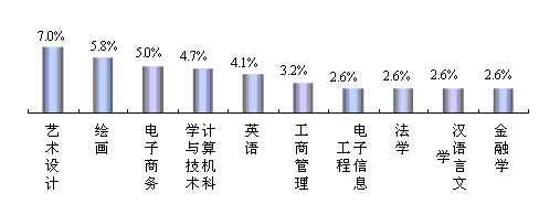 四川省2008届本科毕业生毕业半年后失业量最多的十个专业失业人数占了本科失业量的35.0%,其中有八个专业同时也是2007届失业最多的专业:计算机科学与技术、国际经济与贸易、英语、法学、工商管理、艺术设计、数学与应用数学、电子信息工程。四川省2008届高职高专毕业生毕业半年后失业量最多的五个专业占了高职高专失业量的27.9%,其中计算机应用技术专业同时也是2007届失业最多的专业。调控这些连续造成较大失业量的专业招生结构,并适当调整此类专业的在校学生结构,可以较快地改善总体就业状况。