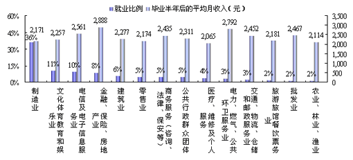 麦可思数据表明,2008届大学毕业生在四川省就业最多的三大行业为“制造业”、“金融、保险、房地产业”、“文化体育教育和娱乐业”。其中,本科毕业生有20%、高职高专毕业生有16%就业于制造业,2008届大学毕业生在四川省就业的行业大类主要集中于制造业;但值得注意的是,但这一比例低于全国2008届本科生(27%)和高职高专(31%)毕业生就业于制造业的比例。