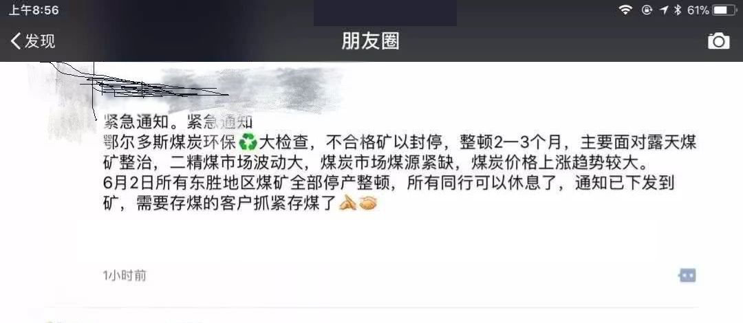 昨日,一条消息在煤炭圈子的朋友刷屏了,主题内容是叙述鄂尔多斯煤炭进行环保检查,将封停不合格的煤矿,而且整检查长达2-3个月,这场检查主要针对露天煤矿,同时6月2日起,东胜所有煤矿全部停产整顿,且通知已下发到各个煤矿。