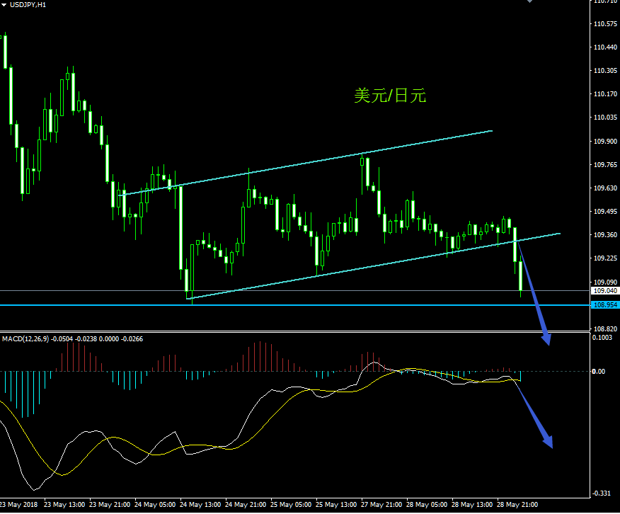 昨日美日全天在通道内小幅度震荡,然而在今日一早就连续下跌,目前接近前方低点108.954附近的小支撑。
