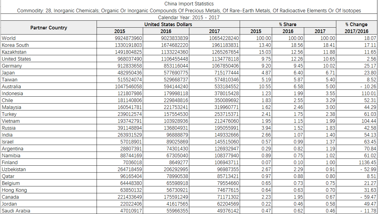 中国进口无机化学品ꎻ贵金属、稀 土金属、放射性元素及 其同位素的有机及无 机化合物