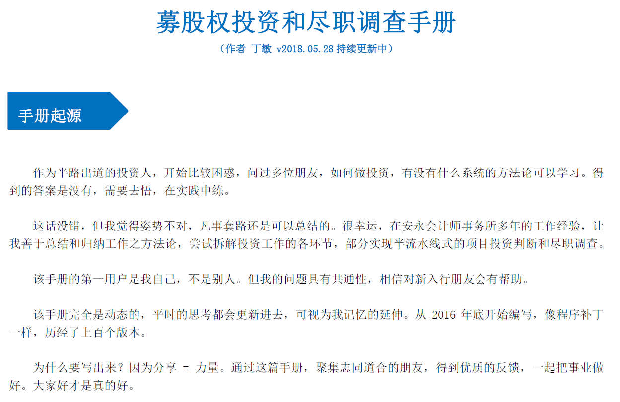 私募股权投资和尽职调查手册 (作者 丁敏)持续更新中 v2018.05.28