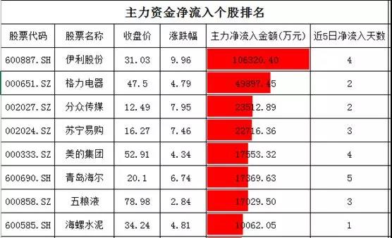麟龙公司指出个股资金方面,资金基本上都是在进攻消费类个股,而且净流入的幅度较大,伊利股份净流入超过10亿元,格力电器净流入近5亿元,苏宁易购、美的集团和青岛海尔也有大幅的净流入。