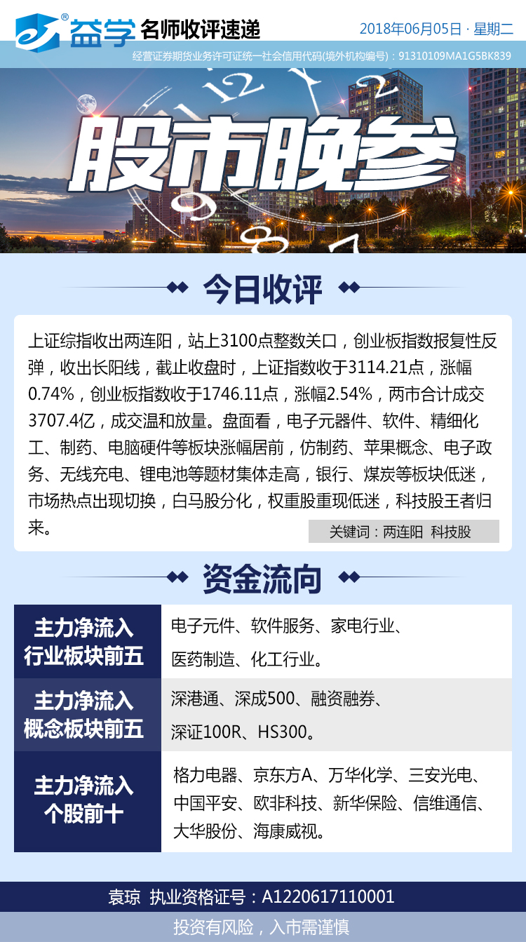 上证综指收出两连阳,站上3100点整数关口,创业板指数报复性反弹,收出长阳线,截止收盘时,上证指数收于3114.21点,涨幅0.74%,创业板指数收于1746.11点,涨幅2.54%,两市合计成交3707.4亿,成交温和放量。盘面看,电子元器件、软件、精细化工、制药、电脑硬件等板块涨幅居前,仿制药、苹果概念、电子政务、无线充电、锂电池等题材集体走高,银行、煤炭等板块低迷,市场热点出现切换,白马股分化,权重股重现低迷,科技股王者归来。