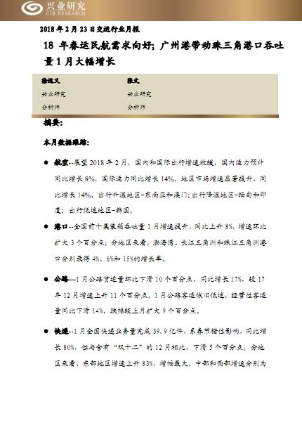 兴业研究-交运行业月报:18年春运民航需求向好,广州港带动珠三角港口吞吐量1月大幅增长.pdf
