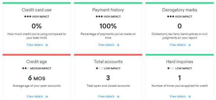 上图是Credit Karma给出的信用分影响拆解。分额度占用(Credit Card Use)、还款历史(Payment History)、负面标记(Derogatory Marks)、信用长度(Credit Age)、总账户数(Total Accounts)及机构查询(Hard Inquiries)六个方面。一般来说额度占用越低、按时还款率越高、负面标记越少、总账户数越多、Hard Pull(同Hard Inquires)越少,信用分越高。
