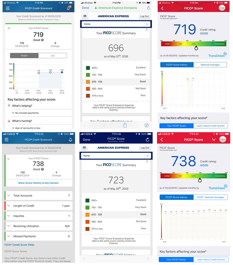 上图分别是使用信用卡半年和一年半左右,TransUnion、Experian和TransUnion三家机构提供的信用分,各自在Discover、AMEX和BOA的APP上可查。信用分一般在用卡半年后陆续在各个信用卡APP上显示,一般来说每月账单日前后会更新一次。