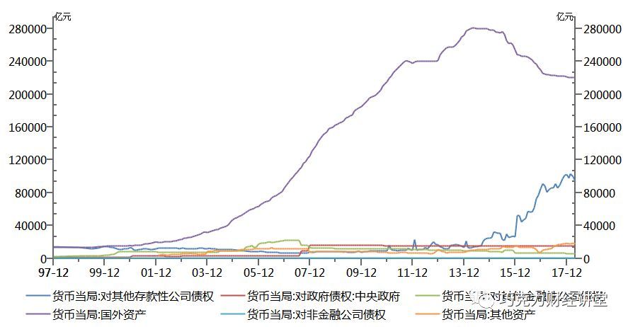 但是,自2013年以来,由于多年的信贷泛滥和放水,国内生产要素价格高企,几乎可以比肩发达国家。资本外流逐渐显现,外汇占款和外汇储备开始下降。从央行负债端来看,外汇占款已经无法持续增加。