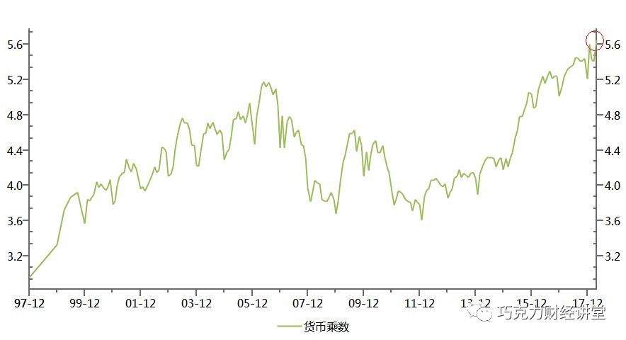 看到没有,货币乘数已经创了历史新高,大约在5.65左右,甚至高于09年大放水的时候的4.8.