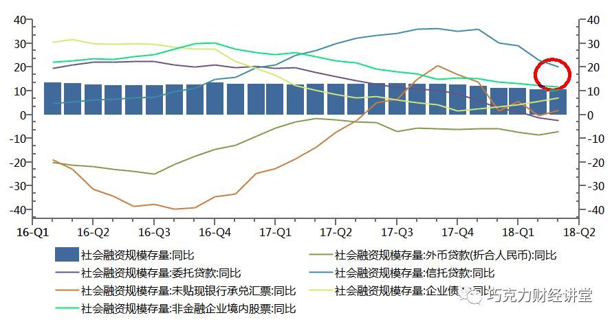 但是好日子没过几天,二月开始,美国方面开始对中国施加强大的压力,到三月份已经演化成为贸易战,四五月伙同欧盟共同发难,六月甚至带上澳大利亚、日本、印度发表联合声明。在此情况下,经济有可能出现不稳的局面。国内去杠杆,表外转表内开始放缓乃至停滞,金融政策开始偏向于稳定经济。