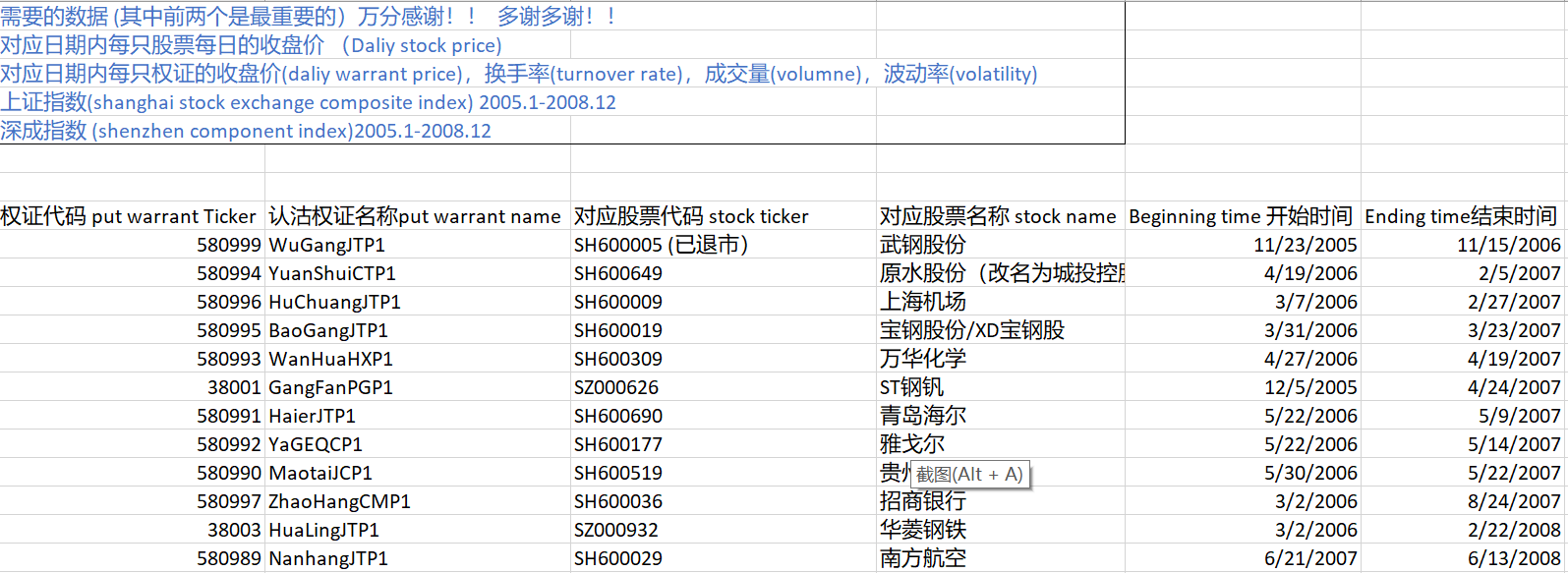 各位大神,小弟初来乍到,现在写毕业论文急需中国2005-2008年间发行的部分权证交易数据,麻烦各位大神指导下怎么才能找到相应数据?或者有数据做过类似研究的能分享一下吗?跪谢!!!!!